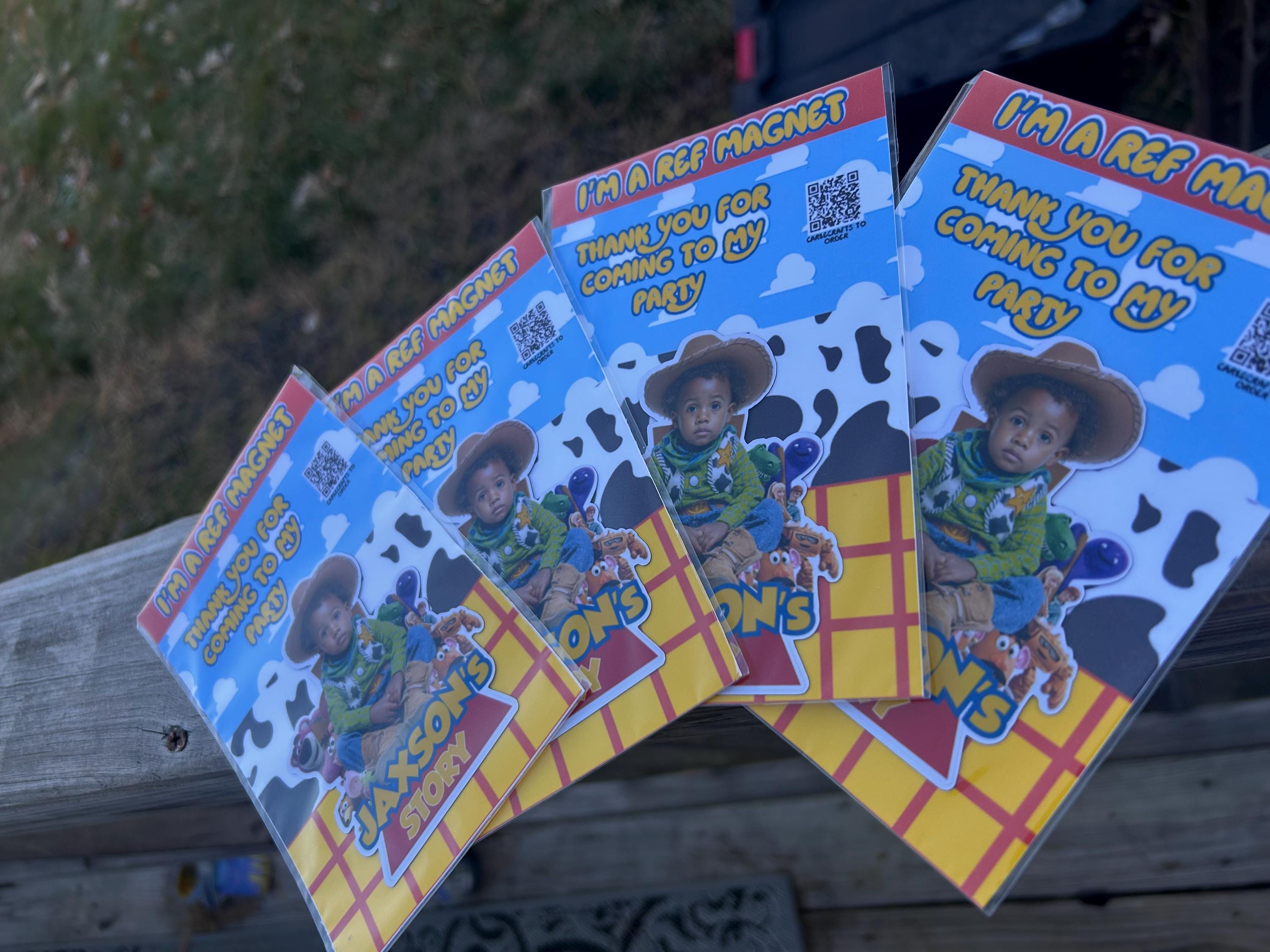 Whether you're planning a birthday party, baby shower, graduation, or a themed event, our magnets are fully personalized with your photo, name, age, and theme colors. This listing features a Toy Story–inspired design, perfect for fans of the adventurous, bright, playful look that matches the beloved movie aesthetic.