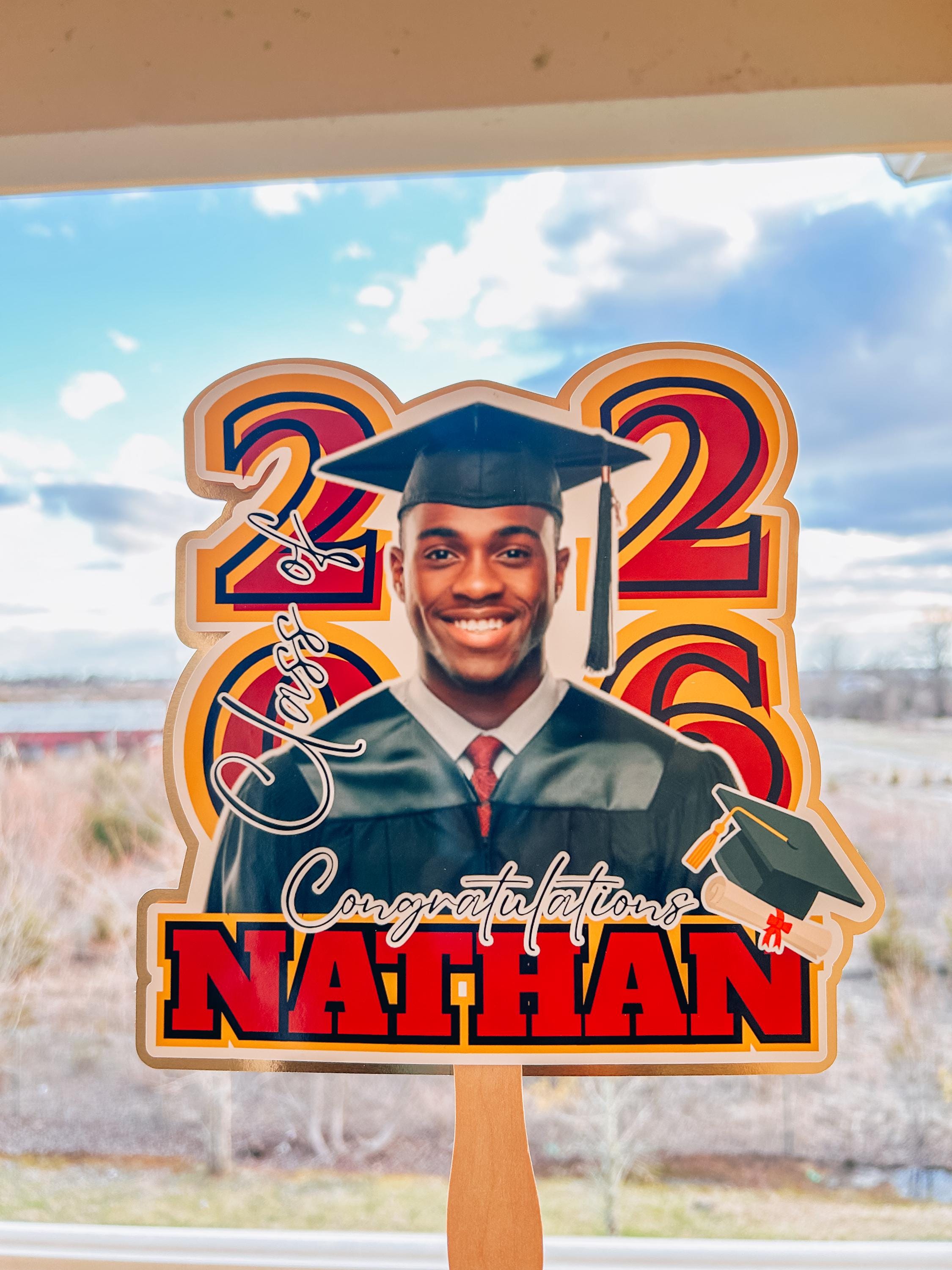 Fully customized with graduate’s photo, name, school, and year (2026)